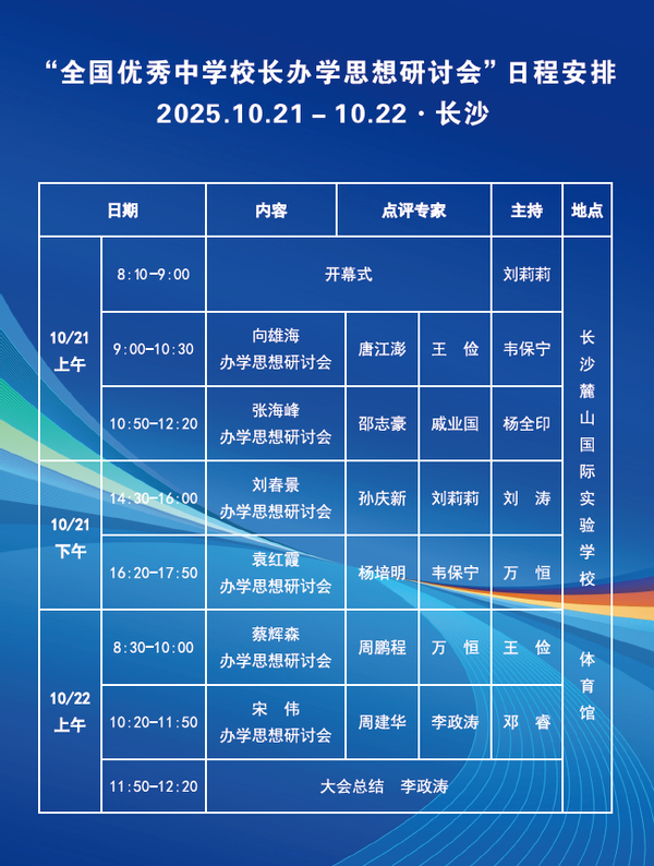 为深入贯彻落实《中共中央国务院关于弘扬教育家精神加强新时代高素质专业化教师队伍建设的意见》和《教育强国建设规划纲要(2024-2035年)》,进一步发挥教育家型校长对区域教育发展的引领带动辐射作用,促进学校育人方式变革,实现教育高质量发展的战略目标,教育部中学校长培训中心将在长沙麓山国际实验学校举办2025年全国优秀中学校长办学思想研讨会。