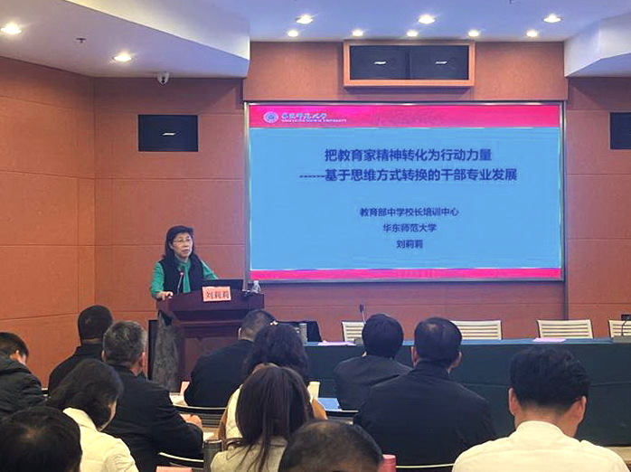 开班典礼后,刘莉莉教授以《把教育家精神转化为行动力量——基于思维方式转换的干部专业发展》为题为学员讲授第一课,她从理论高度与实践深度出发,为全体学员开启了研修的思想之门。刘教授深刻阐释了教育家精神的时代内涵,并着重探讨了如何通过思维方式的转换,将崇高精神内化于心、外化于行,切实推动校长专业发展与学校治理变革。