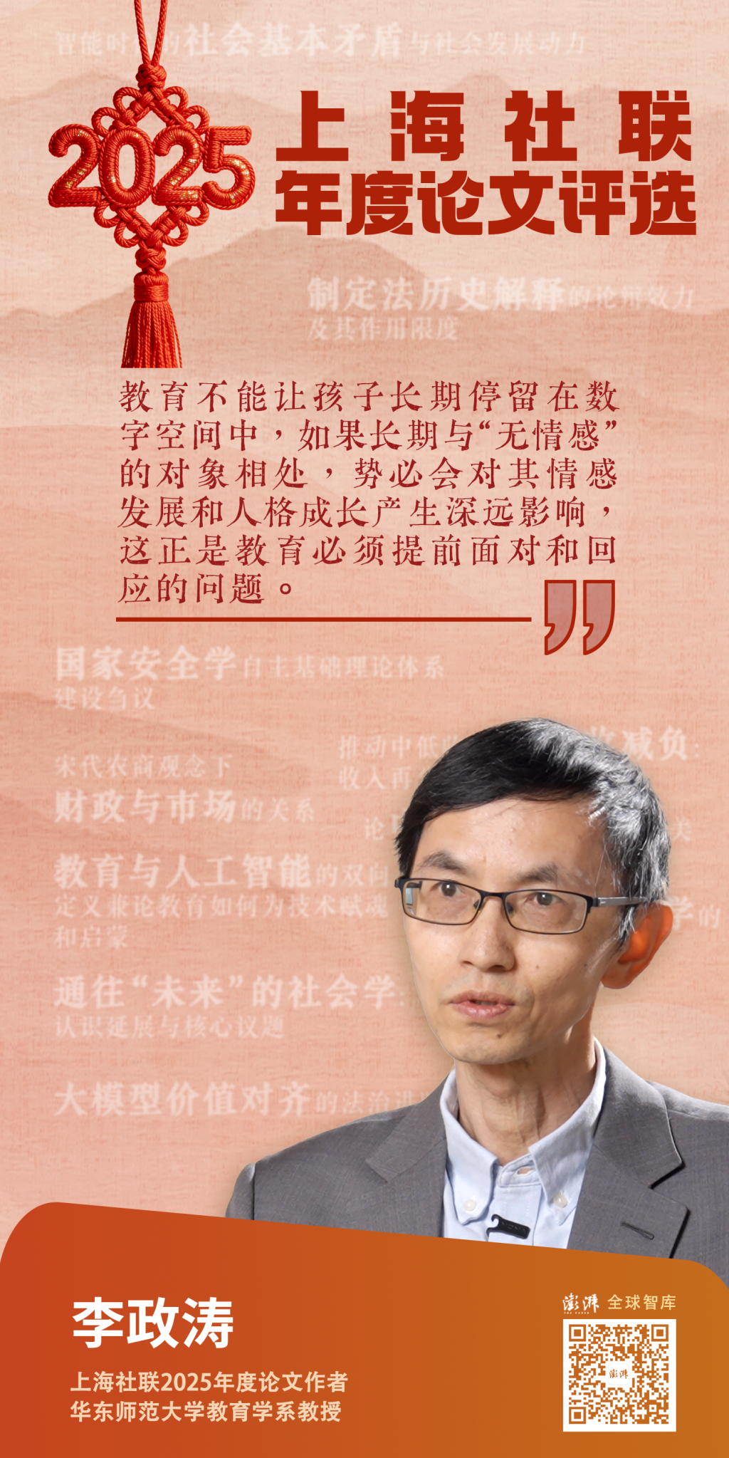 教育变革能否主动牵引而非被动跟从和依附技术变革?在上海社联2025年年度论文《教育与人工智能的双向定义——兼论教育如何为技术赋魂和启蒙》(原载《教育研究》2025年第9期)中,李政涛从逆向思维和双向思维出发指出,技术的进步必须以育人为中心,而不是以技术自身为中心,这也是教育对技术的根本性挑战。为此,他认为,数字技术为教育赋能,教育为数字技术赋魂。技术带来效率与能力,但教育要为其注入价值、情感与伦理。只有在双向赋能的过程中,人类才能在人工智能的推动下获得新的进化空间,并走向真正的共生未来。