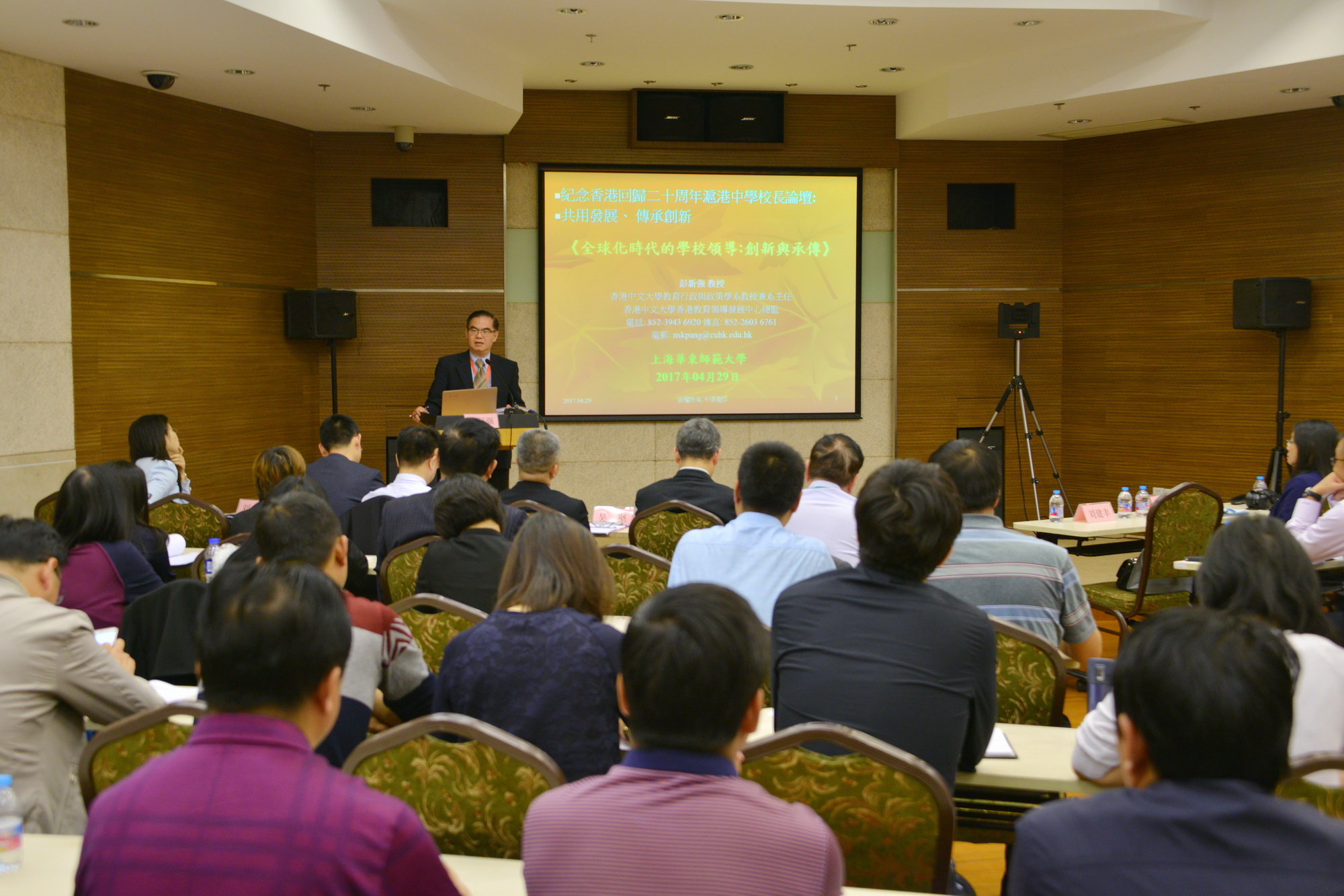以“共享发展,传承创新”为主题的“纪念香港回归二十周年沪港中学校长论坛”由教育部中学校长培训中心主办,香港大中华会协办,上海海外联谊会、上海市教育委员会及香港特区政府教育局支持。来自上海海外联谊会、上海市教育委员会、华东师范大学、香港特区政府教育局、香港中联办教科部、香港大中华会和首届及本届“香港中学校长领导研习班”等的领导和嘉宾,以及上海中学校长代表、上海基础教育界专家和企业家代表等200余人,围绕“共享发展、传承创新”主题进行了深入的交流和研讨。