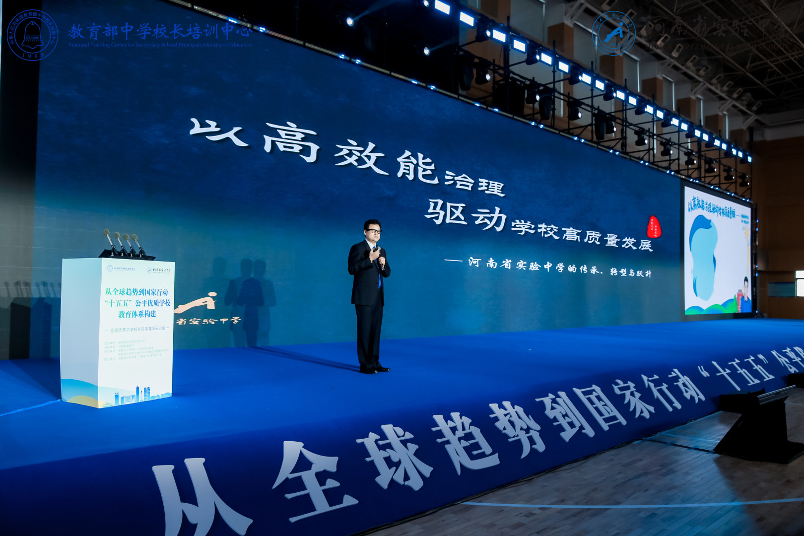 开幕式后,河南省实验中学党委书记王瑞以《以高效能治理驱动学校高质量发展》为题作主旨报告。作为河南基础教育的窗口学校,河南省实验中学传承“异想天开,脚踏实地”校训,确立了“在高度自觉中走向卓越”核心教育理念,构建了“科技+学术”两翼齐飞,“理念构建、队伍建设、机制建构、资源整合”四维支撑和“学生得到成长、教师得到提升、家庭得到幸福、学校得到发展、社会得到满意、国家得到人才”的“两翼、四维、六得”学校治理体系。学校创新实施“寻标—对标—达标—超标—创标”阶梯式治理路径,打造“六家七能”型教师队伍,以教育数字化实现“助教、助学、助研、助评、助管”五助赋能,推进集团化办学与校家社协同育人,积极筹建河南省青少年科创学院,全力建设“科技+学术”型全国一流中学,为新时代普通高中转型发展提供了生动的实践样本。