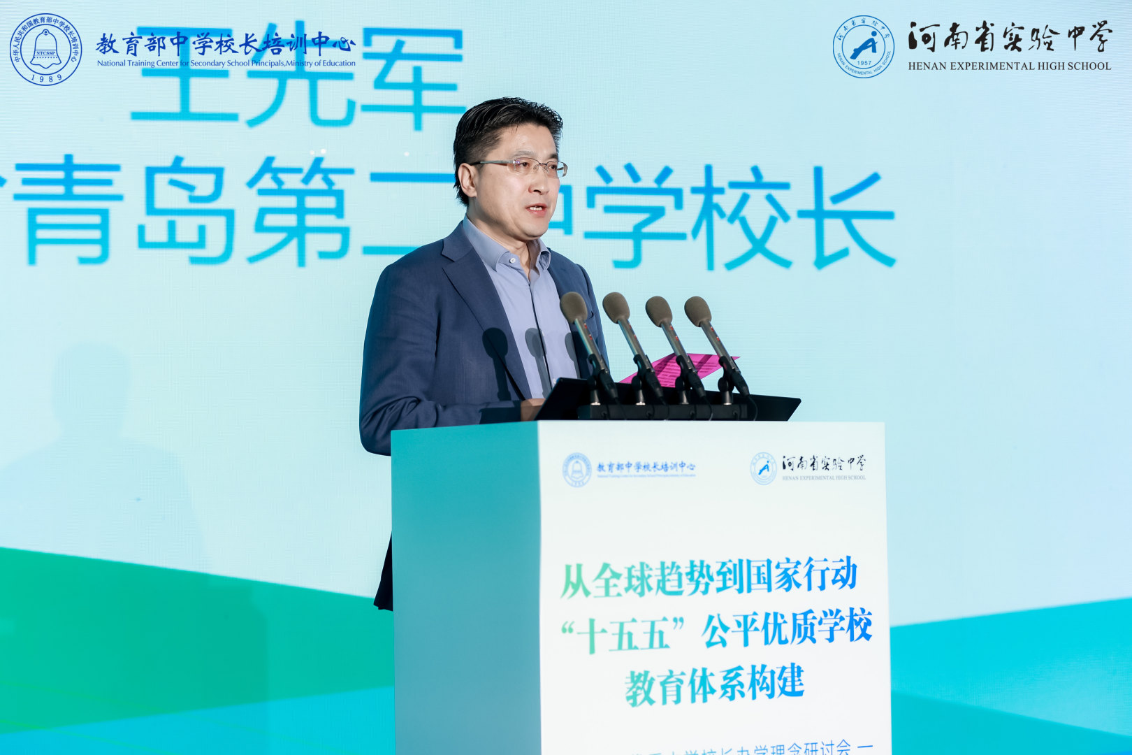 山东省青岛第二中学校长王先军、云南德宏州民族初级中学校长李裕作为教育部新时代“双名计划”高级研究班学员代表发言,分别介绍各自对大会主题的理解以及学校的办学理念与实践回应。